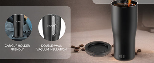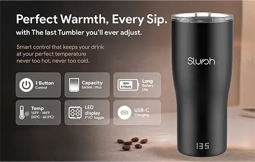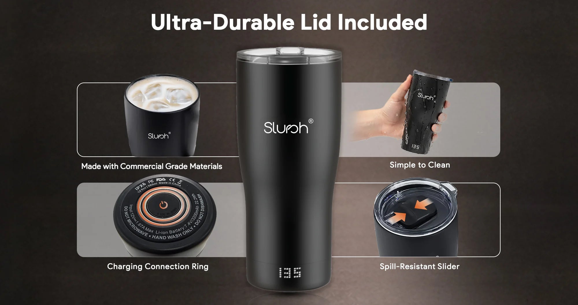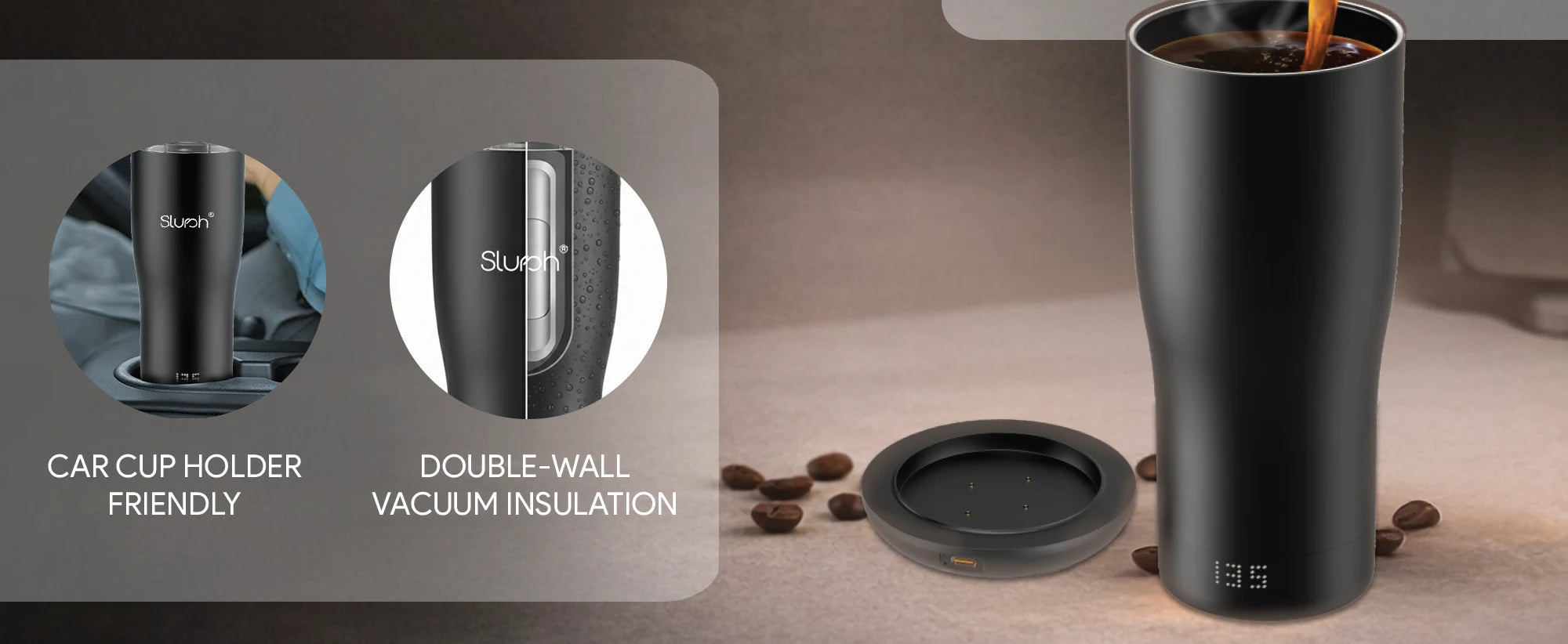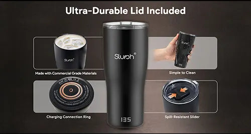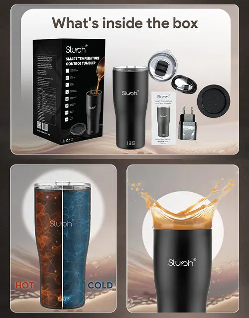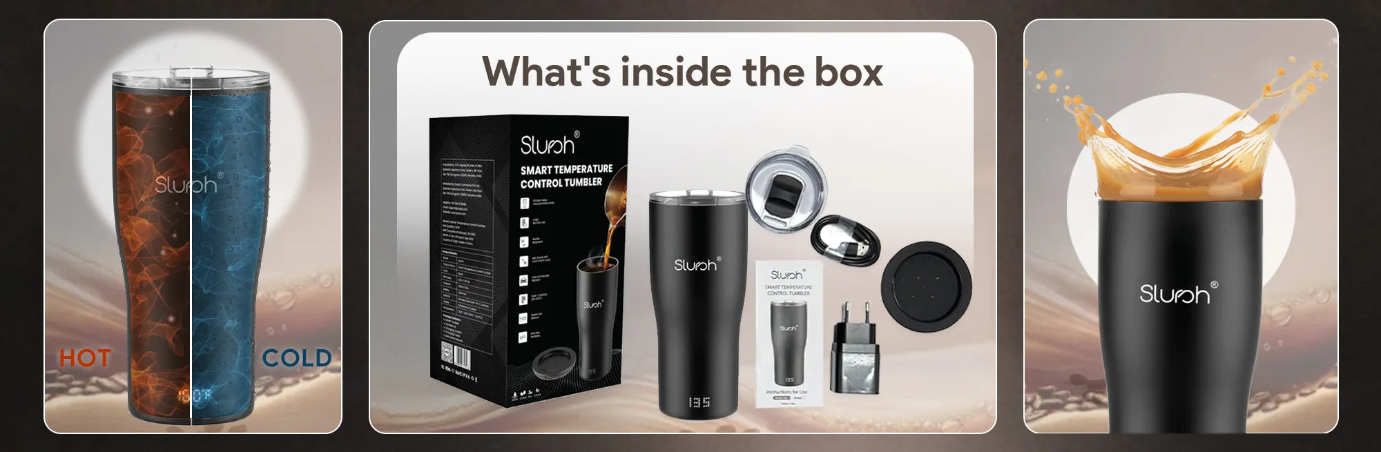 You’ll receive the smart tumbler, leak-resistant lid, wireless charging coaster, Adapter, USB-C cable, user manual, and quick-start guide.